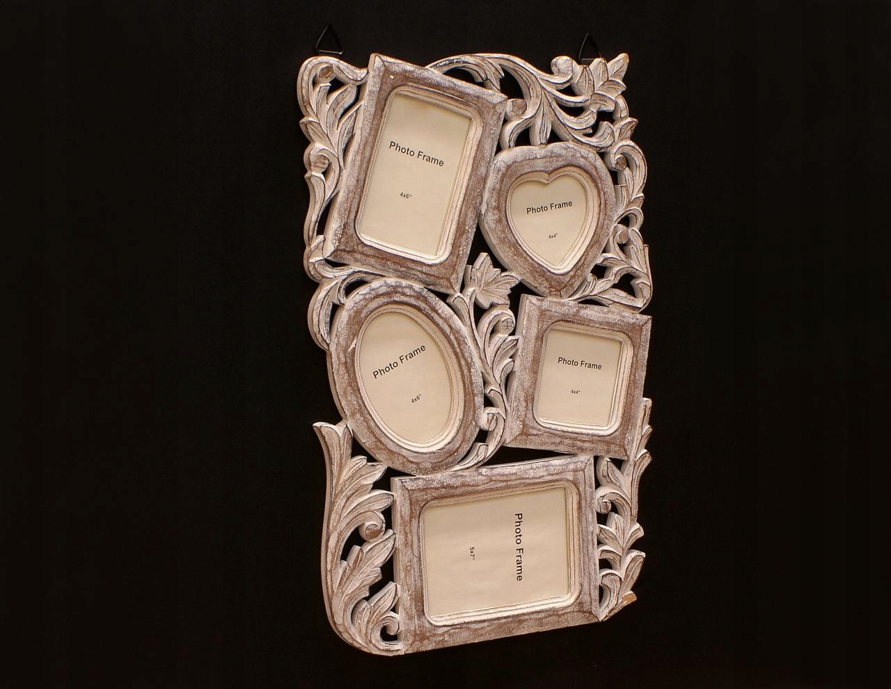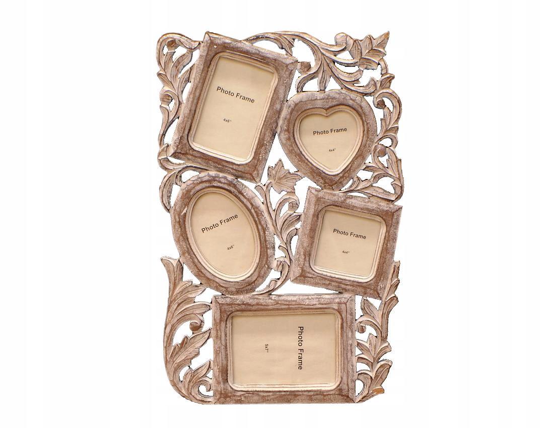 Drewniana ramka rodzinna, wisząca w stylu retro, na 7 zdjęć: jedno zdjęcie formatu 10x15 cm, jedno formatu 13x18 cm, jedno 10x10 cm, owalne 10x15 cm oraz w kształcie serca 10x10,5 cm. Zdjęcia są osłonięte szklaną szybką. Ramka wykonana w Indiach z drewna egzotycznego, przecierana, w odcieniach bieli i szarości, posiada 2 uchwyty do powieszenia na ścianie. Produkt w 100% oryginalny indyjski, najwyższej jakości.