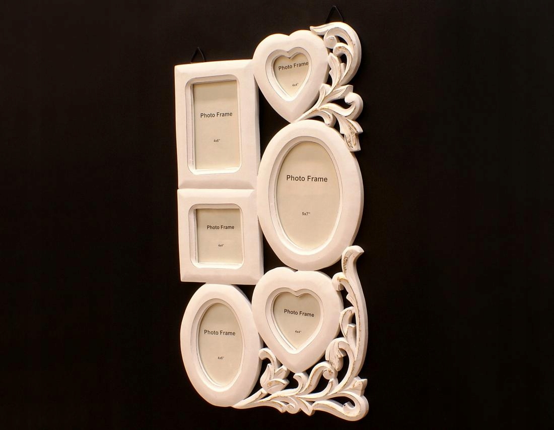 Drewniana ramka rodzinna, wisząca w stylu retro, na 6 zdjęć: jedno zdjęcie formatu 10x15 cm, jedno formatu 10x10 cm, owalne: jedno 10x15 cm, drugie 13x18 cm oraz w kształcie serca: mniejsze 7,7x8,4 cm, większe 10x10,5 cm. Zdjęcia są osłonięte szklaną szybką. Ramka wykonana w Indiach z drewna egzotycznego, pomalowana na biało, posiada 2 uchwyty do powieszenia na ścianie. Produkt w 100% oryginalny indyjski, najwyższej jakości.