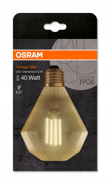Żarówka dekoracyjna LED uznanej na rynku marki OSRAM z serii VINTAGE 1906 model DIAMOND to źródło światła osadzone w szklanej przezroczystej bańce w kolorze złotym które cechuje się przede wszystkim energooszczędnością uzyskaną z w zastosowania nowoczesnej technologii włókien LED. OSRAM Vintage 1906 Diamond z trzonkiem E27 o mocy 4,5W (odpowiednik klasycznej żarówki o mocy 40W) emituje ciepłą barwę światła 2500K, zaś strumień świetlny wynosi 420lm. Klasyczny styl i wygląd prezentowanej ozdobnej żarówki VINTAGE świetnie wkomponuje się z każdym wystrojem wnętrz oświetlając je przyjemnym dla oka światłem. Osram Vintage 1906 Diamond to żarówki które najlepiej pasują do opraw w stylu minimalistycznym lub nowoczesnym. Żarówka LED Osram Vintege 1906 może być montowana we wszystkie tradycyjne oprawy z gniazdem E27 co sprawia że wymiana starej żarówki na ten model jest banalnie prosta. Decydując się na zakup żarówki ozdobnej LED OSRAM Vintage otrzymujemy produkt wysokiej klasy który spełni nasze oczekiwania, a zarazem będzie użytkowany przez bardzo długi czas.