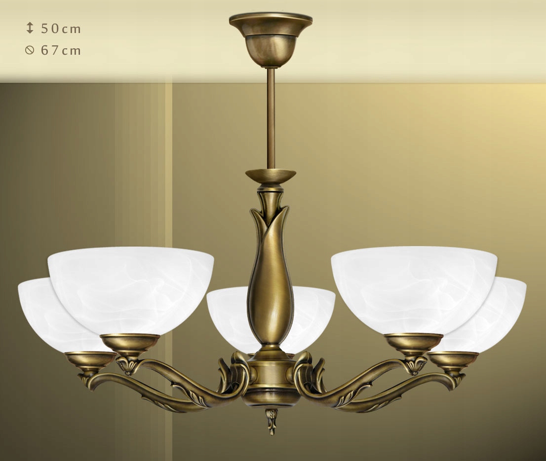 wymiary: wysokość lampy 50cm (możliwość wykonania lampy skróconej lub przedłużonej), średnica lampy 67cm, średnica kloszy 19cm- źródło światła: 5xE27 (żarówki tradycyjne/żarowe o mocy max. 60W lub żarówki energooszczędne albo LED o większej mocy - np. odpowiednik 100W)