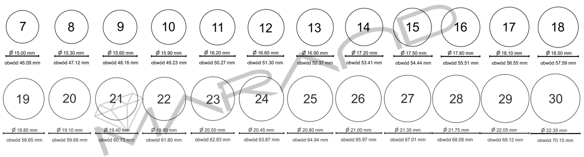 - Tasiemką lub sznureczkiem zmierz obwód palca i porównaj z obwodami w tabeli, odczytaj właściwy rozmiar.