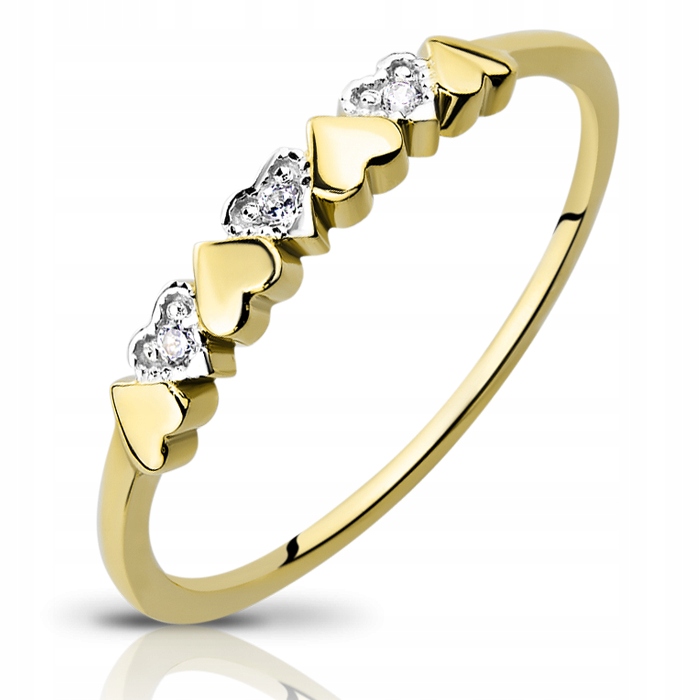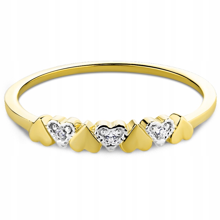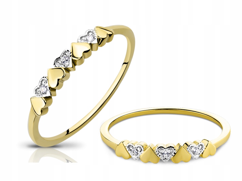 Elegancki, subtelny i nowoczesny złoty pierścionek w niezwykle ciekawej formie obrączki udekorowanej połączonymi sercami. Co drugie serce wysadzane jest lśniącymi cyrkoniami.