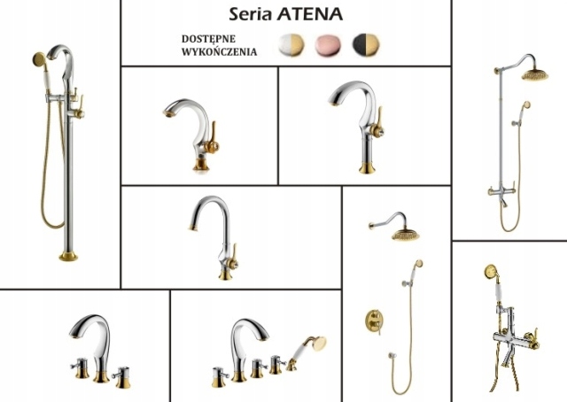 Armatura sanitarna z serii ATENA reprezentuje styl prosty lecz elegancki. Skierowana jest do ludzi ceniących piękno i wieczną klasykę. Tradycyjne formy wraz z nowoczesnymi aplikacjami w postaci diamentowych elementów oraz wykończenie w połączeniu złota i chromu bądź czerni dodają bateriom wytworności i wdzięku.