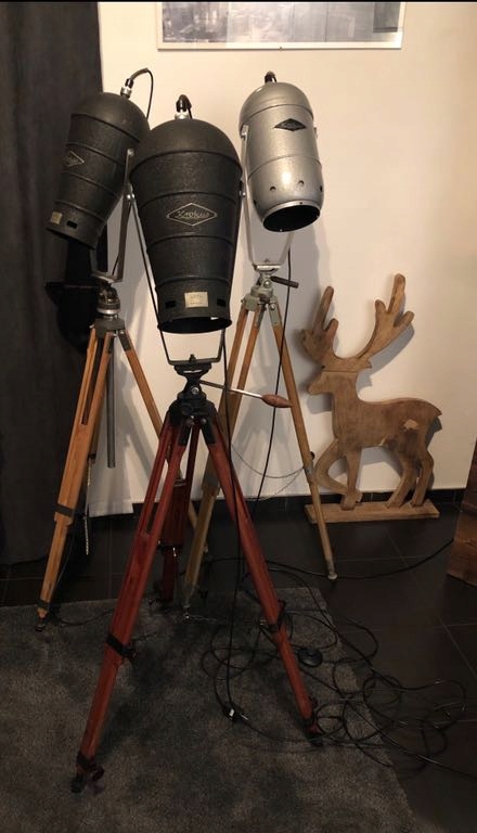 Zrobiona ze starego statywu fotograficznego i starej lampy fotograficznej. Regulowana wysokość lampy, żarówka na duży gwint, aktualnie led.