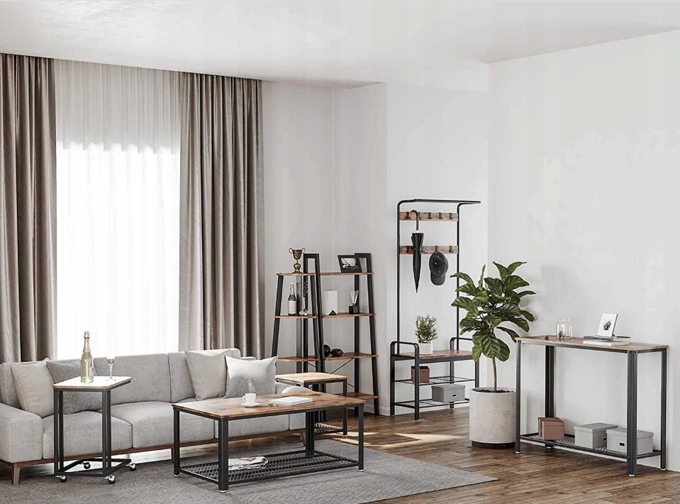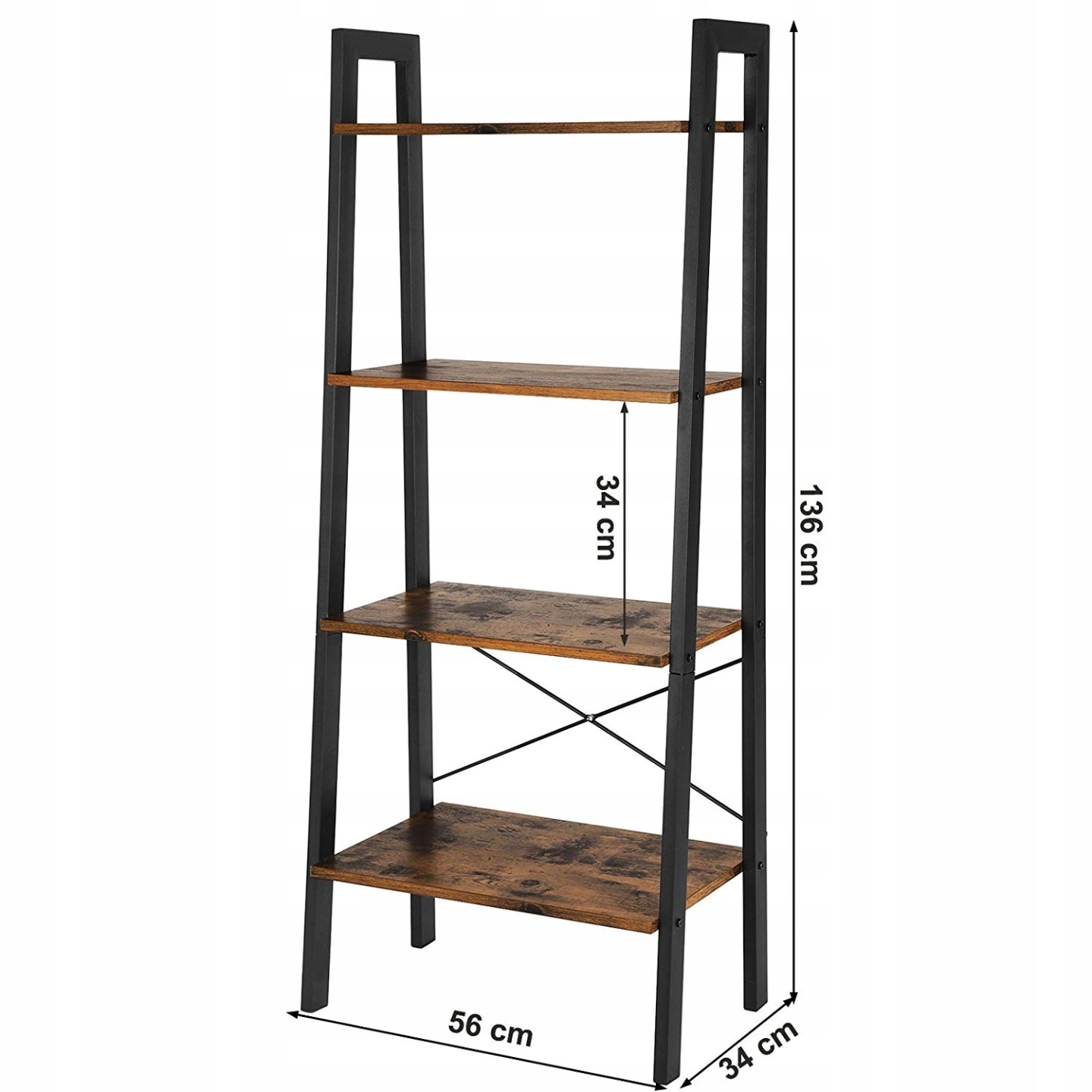 Nowoczesny regał na książki, lub inne drobiazgi wykonany w stylu vintage. Czarna metalowa rama zapewnia stabilną konstrukcje. Półki w przecieranym kolorze drewna nadają stylu i nietypowego designu.