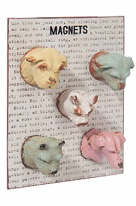 Komplet pięciu magnesów na lodówkę w kształcie psich głów. Każdy w innym kolorze, mocno przecierany, sprawiający wrażenie starego, niedopracowanego, a przez to niepowtarzalny.
