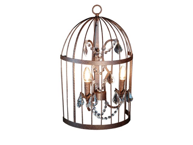Kinkiet metalowy w formie modnej klatki na ptaki z kryształami w środku.Wykończenie powierzchni metalu techniką sztucznego podstarzania (rdzawienia),poprzez odpowiednie nakładanie 2 warstw farby w tonacji brązowej.Oprawki elektryczne z tradycyjnym trzonkiem typu E14.Do lampy stosujemy 2 zwykłe żarówki o mocy max 40W.Standardowa oprawka elektryczna pozwala na zastosowanie dowolnego rodzaju żarówki z gwintem typu E14.Wymiary klosza lampy 34cm(szer.)*56cm(wys.)*15cm (głębokość/odległość od ściany).