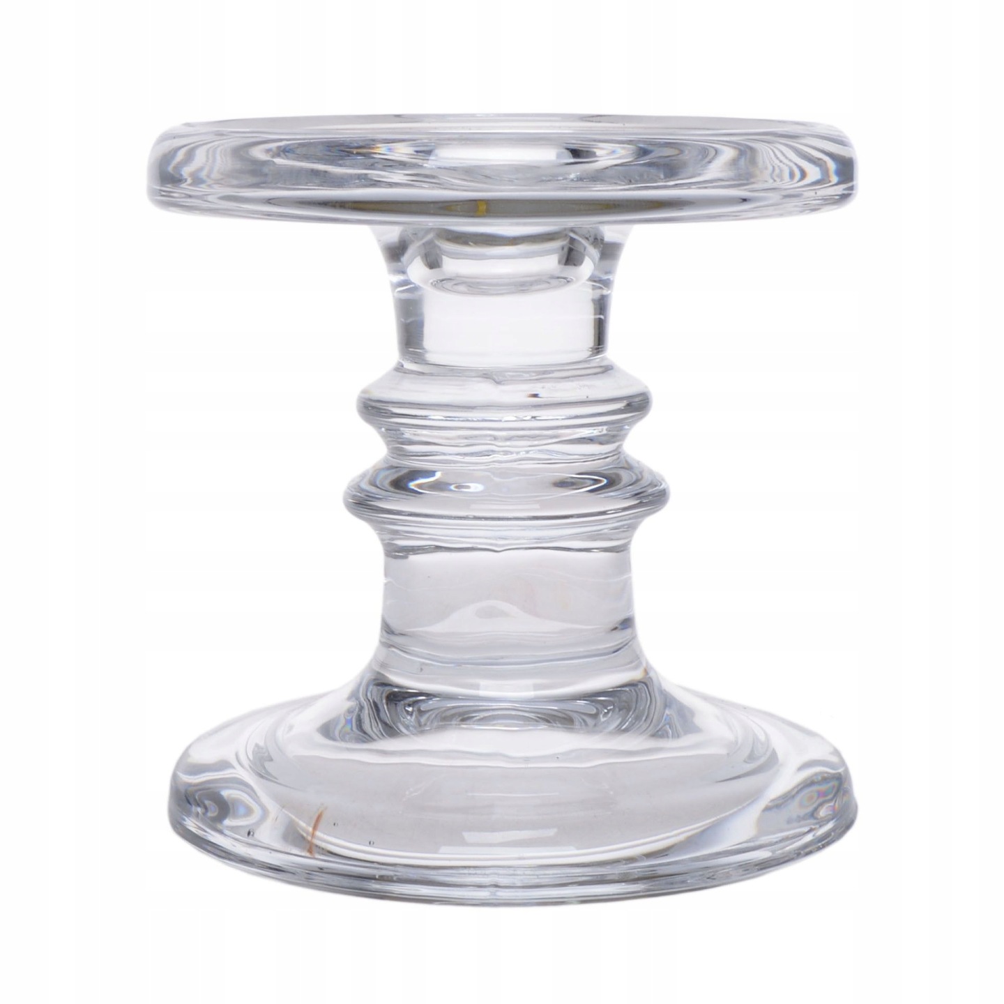 Szklany świecznik na szeroką świeczkę. Prosty i elegancki dodatek do salonu, na którym postawisz świecę - walec aby mogła stać stabilnie. Przezroczysty świecznik z ręcznie formowanego szkła wykonano w klasycznej stylistyce pasującej do każdego wystroju wnętrza. Okrągła ozdoba zachwyca swoją formą.
