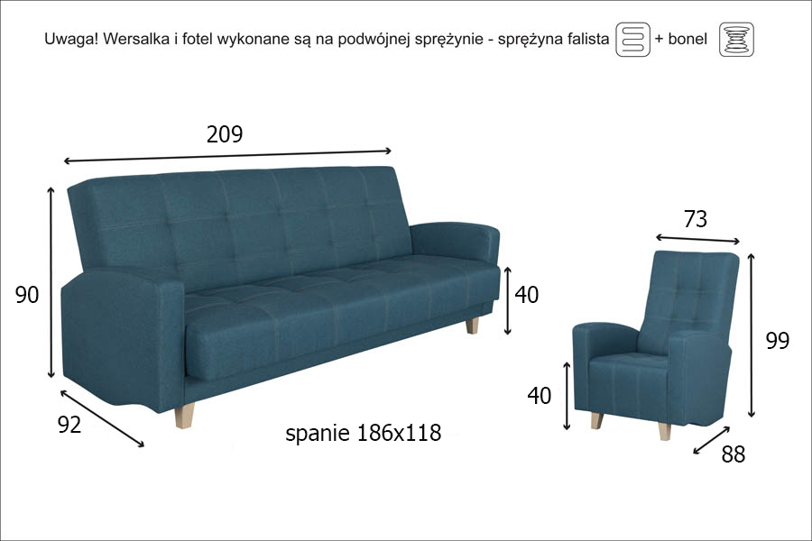 - siedzisko wykonane na podwójnej sprężynie: sprężyna falista + bonell sprężynowy 13 cm + pianka wysokoelastyczna HR
