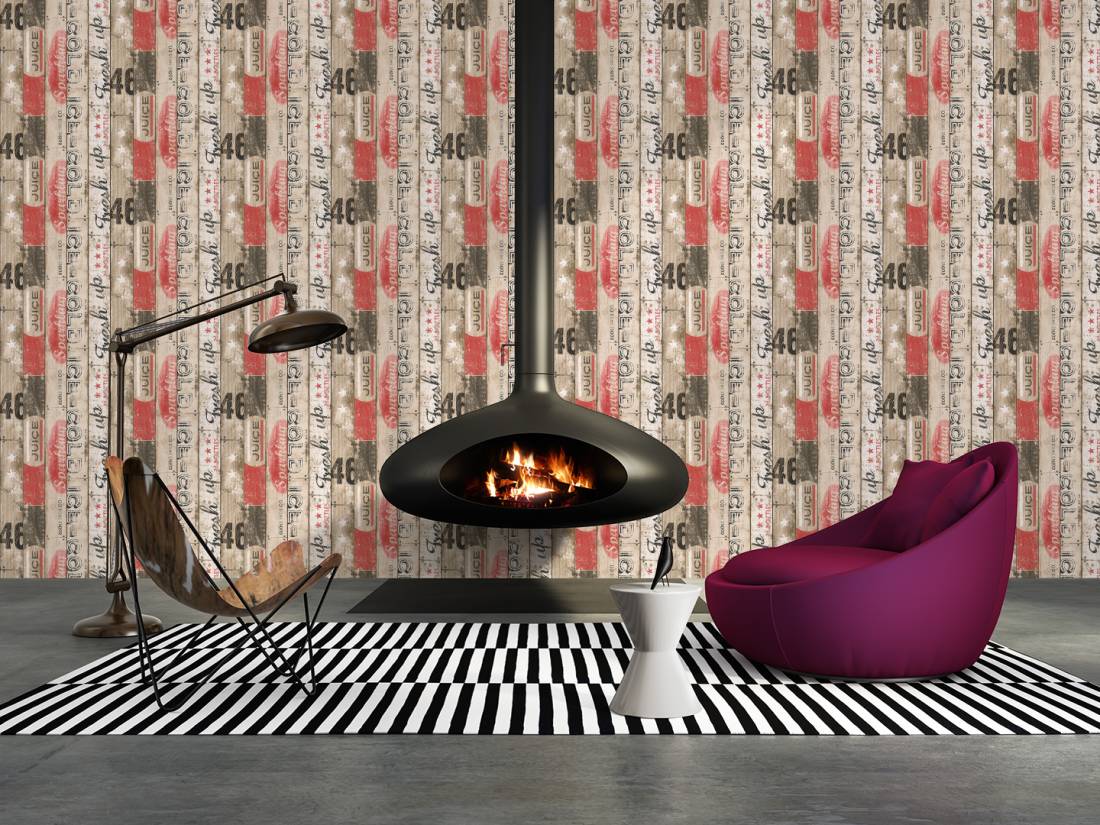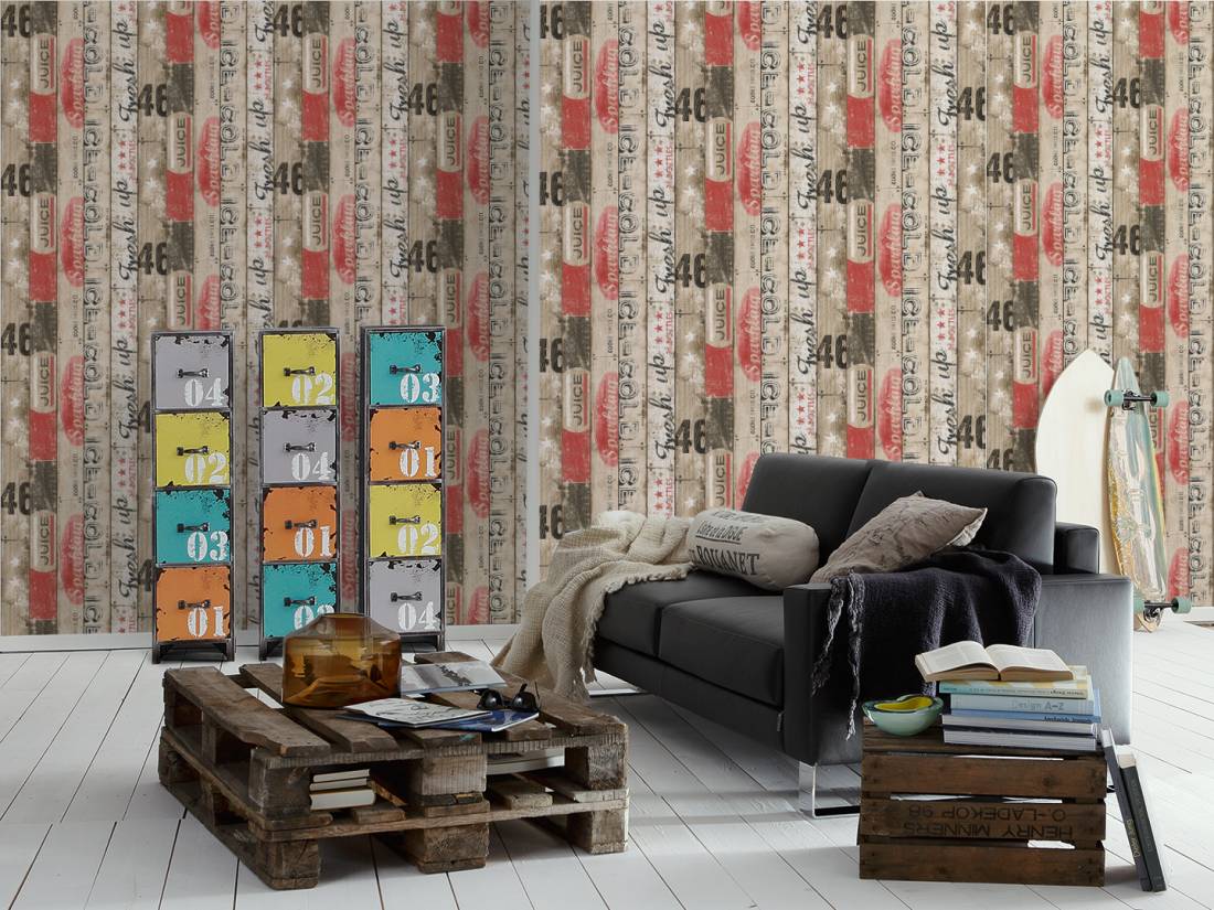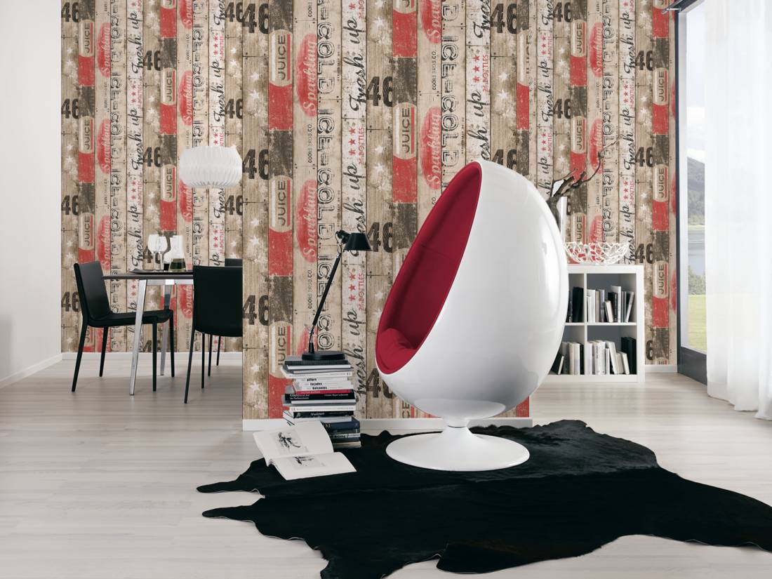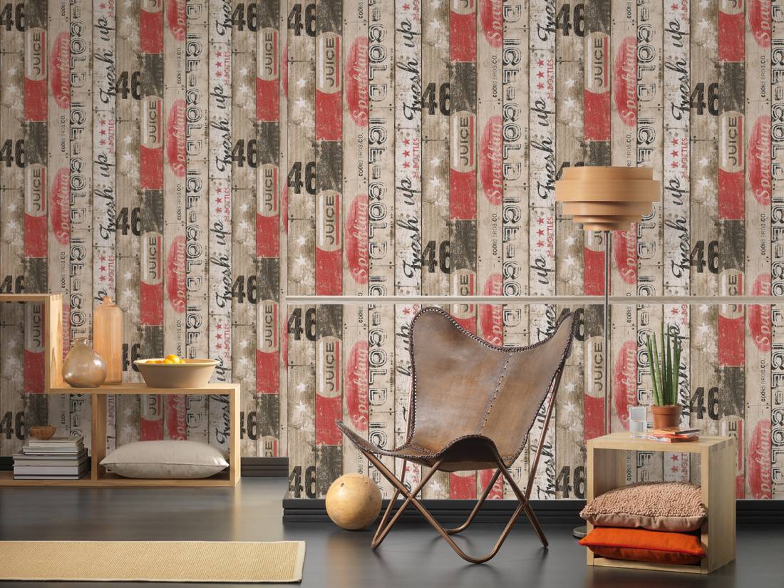 Opis wzoru: Unikalna Tapeta ścienna o niesztampowym wzorze. Kompozycja przedstawia drewniane deski, pomalowane na beż, biel, czerwień i czerń. Pomysłowo połączone kolory zestawiono z oldschoolowymi napisami, tworząc wyrazisty, atrakcyjny obraz.