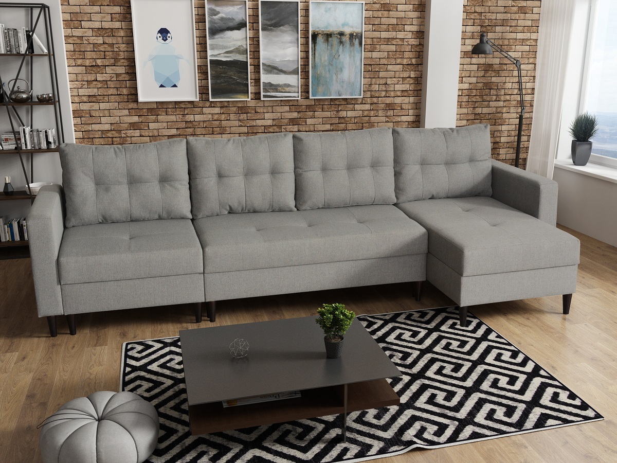 Narożnik VINTAGE ZF1 to jedna z przykładowych konfiguracji mebla z elementów systemu modułowego od firmy ZEUSmeble. Kolekcja VINTAGE stanowi ciekawe połączenie stylowego skandynawskiego designu z wysoką funkcjonalnością - została zaprojektowana tak aby wpasować się w mocno modernistyczne wnętrza jak i te klasycznym designie. Geometryczne kształty, szerokie i głębokie siedziska oraz masywna konstrukcja została oswojona poprzez zastosowanie wysokich drewnianych nóg, licznych przeszyć i pikowań co w efekcie tworzy bardzo smukły i lekki mebel. Mebel jest wyposażony w przeszywane i pikowane poduszki wypełnione kulką silikonową . Dzięki zastosowaniu odpowiedniej twardości siedziska i oparcia komfort wypoczynku podczas siedzenia na naszych meblach jest bardzo wysoki. Kolejnym atutem tego mebla jest funkcja spania i pojemniki na pościel. Materac zbudowany ze sprężyn bonellowych oraz pianki wysokoelastycznej, jest zapewnieniem komfortowego i wygodnego wypoczynku.. Nasze meble cechuje wzorowe wykonanie, nowoczesny wygląd oraz wolnostojąca bryła. Jest to narożnik komfortowy dla każdego, a zarazem designerski. Ponadto model ten dostępny jest w szerokiej gamie kolorystycznej oraz bogatym wachlarzu tkanin, dzięki czemu wkomponuje się idealnie w projekt każdego salonu.