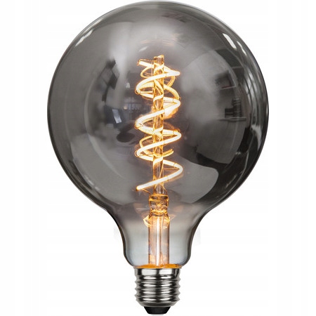 Najnowszej generacji żarówka G125 (średnica 12,5 cm) w czarnym, dymionym szkle, z niezwykle efektownie ukształtowanymi ,,pręcikami" filament, typu stary ,,EDISON".