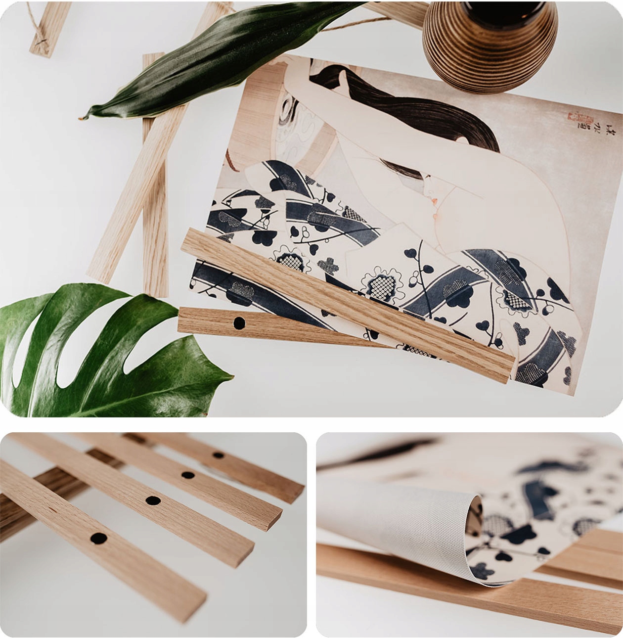 • Dębowe ramki mają wmontowane silne magnesy, które przytrzymają plakat, oraz sznurek jutowy;